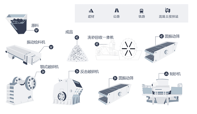 組成設備:振動給料機、顎式深夜黄色网站、深夜福利导航APP(直通衝擊式深夜黄色网站)、振動篩、洗砂機、膠帶輸送機、集中電控等